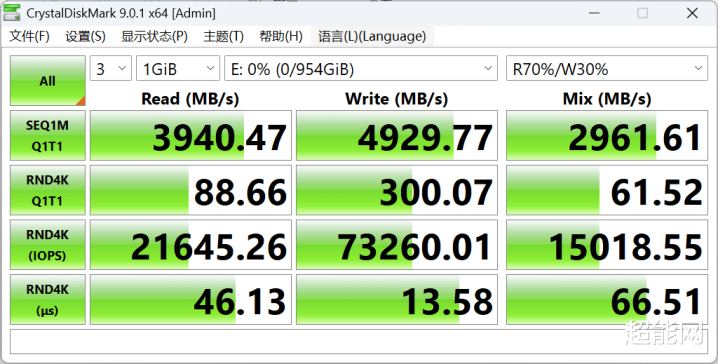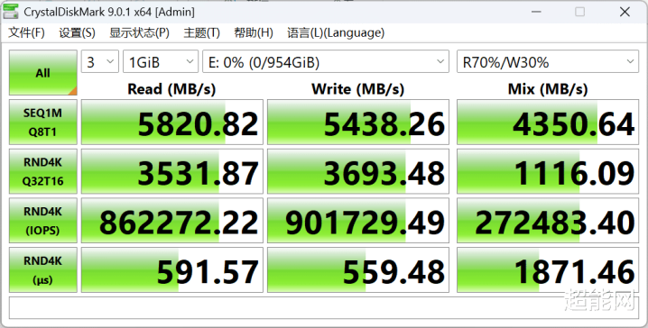 在用完了这个PC41Q 1TB的所有TBW之后,我们重新对这个SSD分区并用CrystalDiskMark对其进行了性能测试,峰值读取速度能到5800MB/s,写入速度也有5400MB/s。